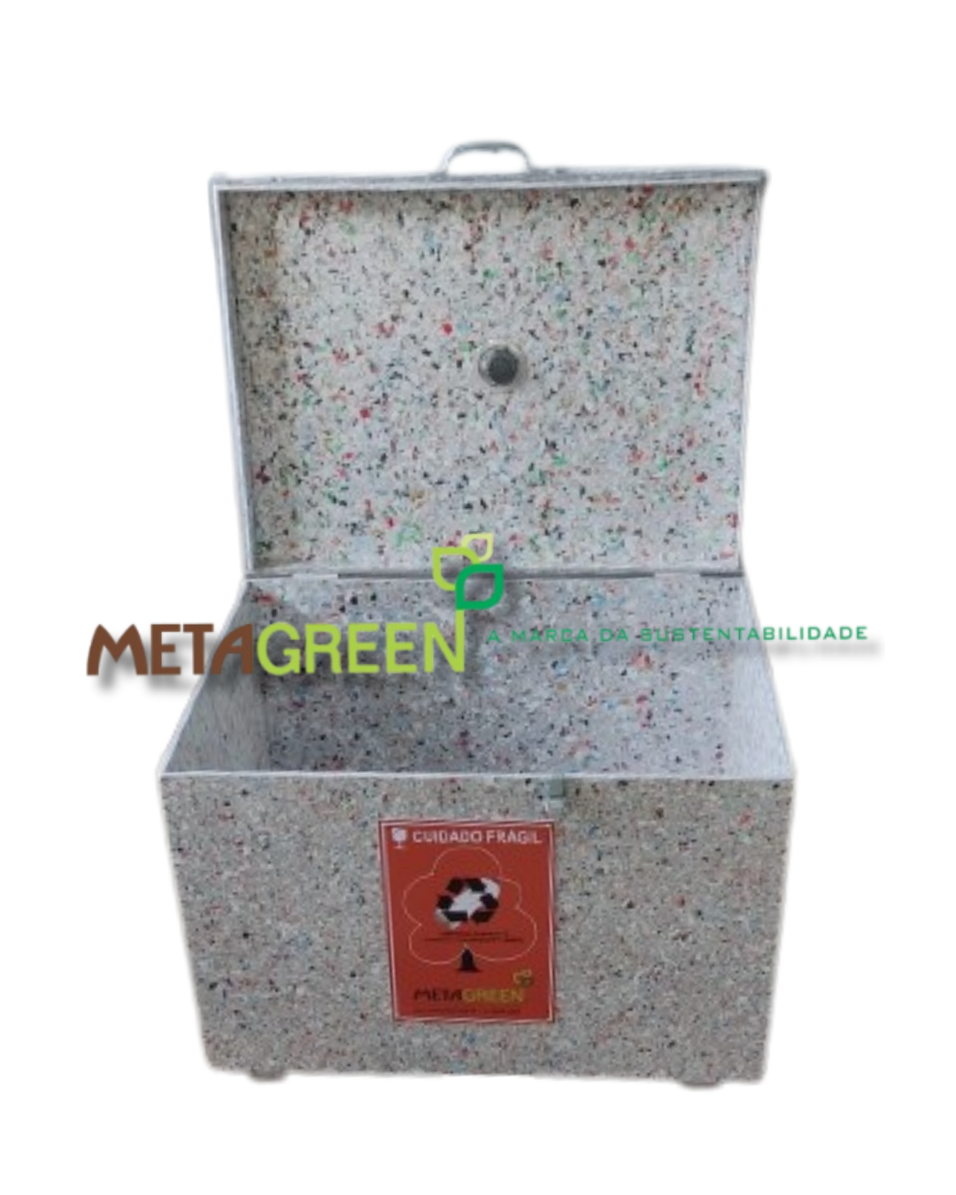 Caixa ecológica para armazenamento e descarte de lâmpadas usadas, com filtro de carvão ativado, fechadura na tampa para uso de cadeado, dobradiças de alumínio, alça, base paletizada para manuseio e placa de identificação do resíduo.